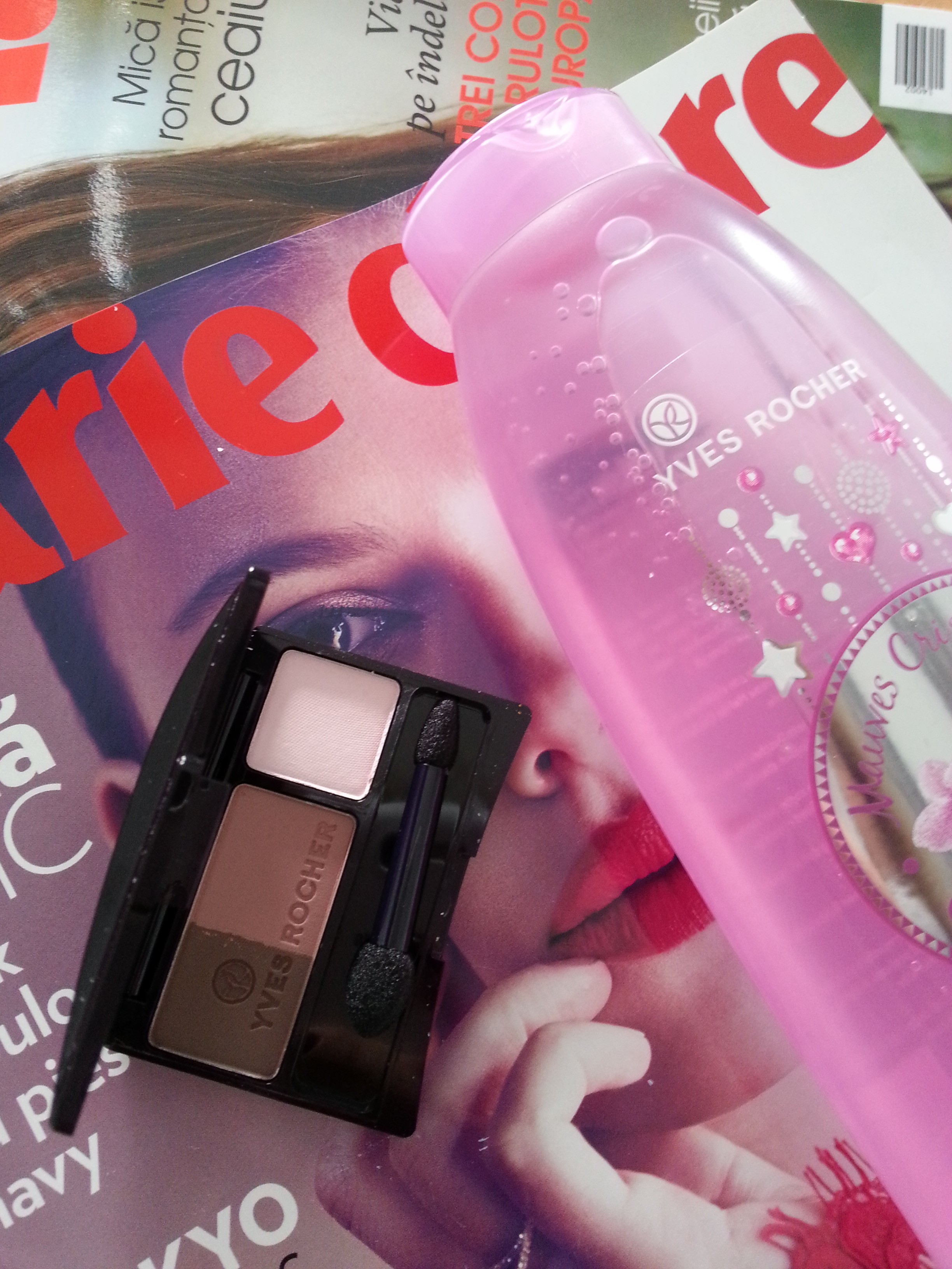 Vinerea asta m-am rasfatat de dimineata, cu doua reviste si cadourile lor, revista Marie Claire, cu un gel de dus Yves Rocher, si revista Femeia, cu o mini paleta Yves Rocher, 3 culori care imi sunt prietene, asa ca voi tine paleta asta la birou, pentru zile in care am nevoie de retus, sau zile in care nu ma machiez mai deloc si am nevoie de putina culoare pe parcursul zilei.